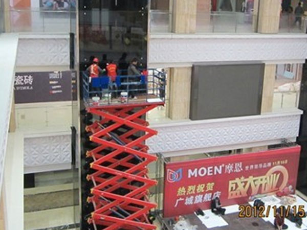 迪邦保潔公司保潔員正在為“廣城家居建材市場”做室內觀光電梯外墻清洗。